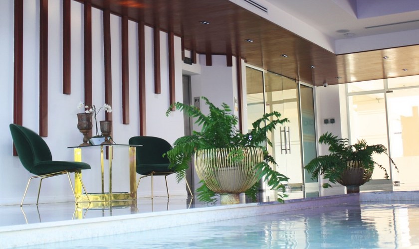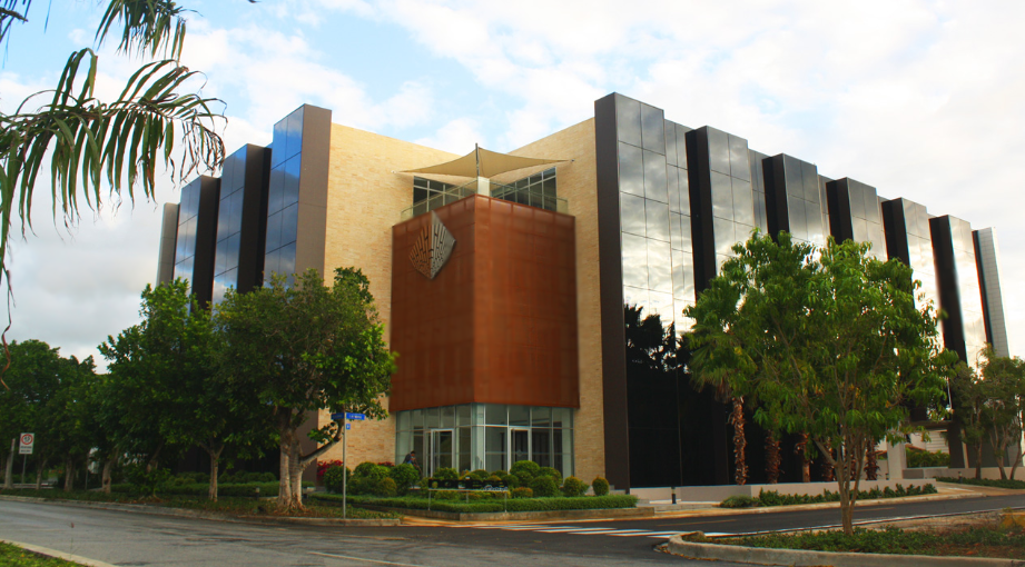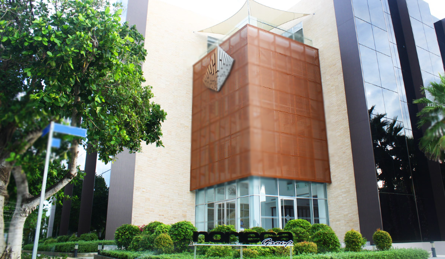 Corporativo con áreas comunes como terraza, comedor, salones de conferencias, parqueos techados.